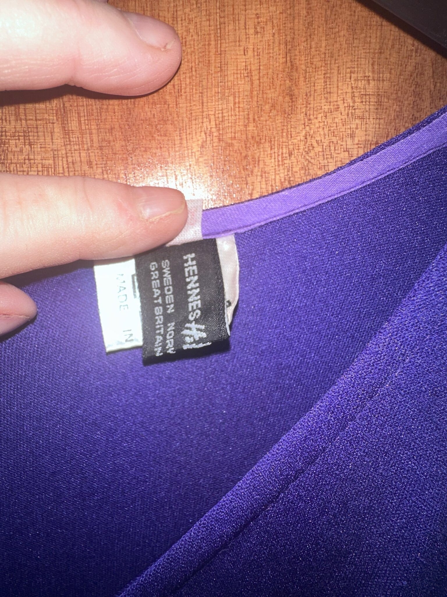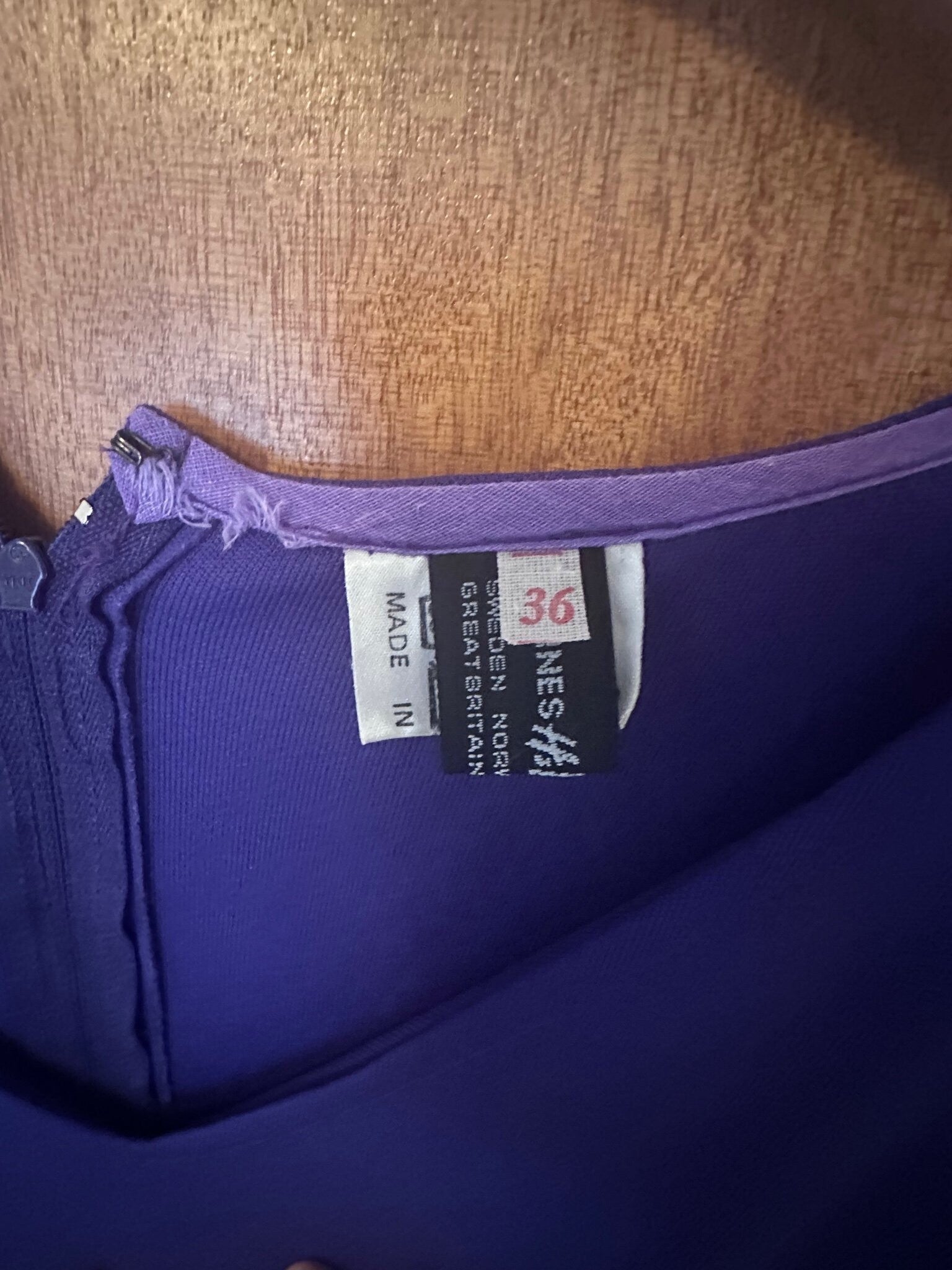 Lila klänning med v-ringning och korta ärmar från 70-talet. Klänningen har en markerad midja och en kjol i flera lager med asymmetrisk fåll. Det finns ett band i midjan som kan knytas. Klänningen stängs med dragkedja i ryggen.
